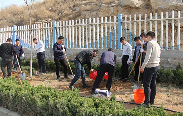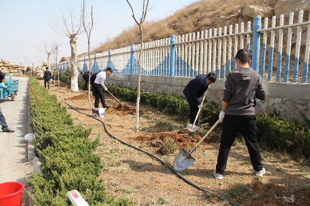 陽春三月的下午,風和日麗。大家三五個人分組行動,他們爭先恐后,干勁十足,先在指定的位置將樹坑挖深挖大,后將樹苗扶正,填土,踩實,澆水,最后覆蓋一層薄土以保持水分,配合行動,每個人從挖坑、種樹到澆水每個環(huán)節(jié)都積極踴躍參與,好一派熱火朝天的繁忙景象,經(jīng)過兩個多小時的辛勤勞動,團員青年們一共種植16棵松樹和2棵櫻花樹,圓滿完成了植樹任務.